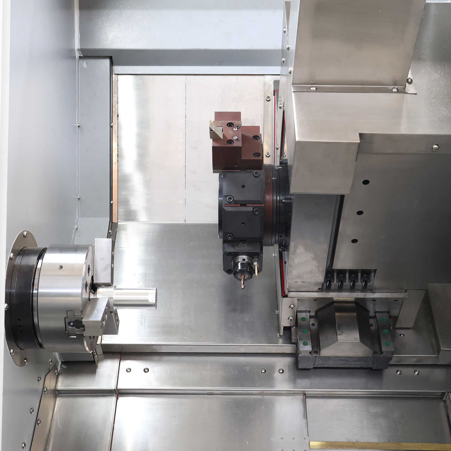 A. Turning and Milling: The Y-axis is integrated with the powered turret and milling head to enable multiple processes, including turning, milling, and drilling, to be completed on a single machine. For example, when machining automotive timing pulleys, the turning tool can simultaneously perform axial grooving and side hole milling, reducing overall work time by 42%.